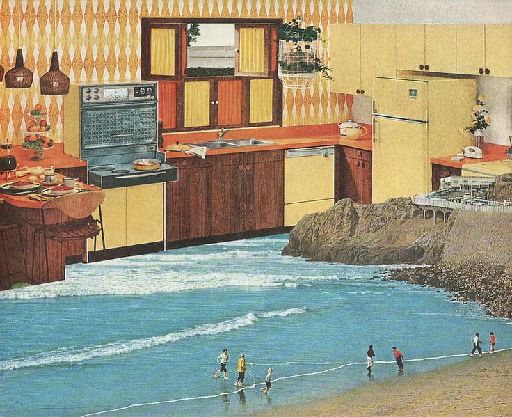 On reste dans le rétro avec le travail de Nadine Boughton qui joue avec les clichés de l’Amérique des années 50 en mixant magazines d’aventures destinés aux hommes et magazines de décoration et catalogues de produits pour la maison, destinés aux femmes. La femme au foyer parfaite se retrouve ainsi propulsée dans un monde peuplé d’embûches tandis que bêtes sauvages, pin-ups et pirates envahissent les intérieurs typiques de l’époque.