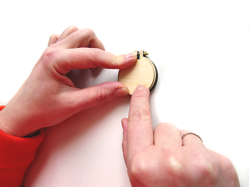 Placez votre motif sur le plus petit des cercles de bois en faisant attention à bien le centrer. Une fois positionné, glissez l’ensemble à l’intérieur de votre mini-tambour jusqu’au bord supérieur de celui-ci.