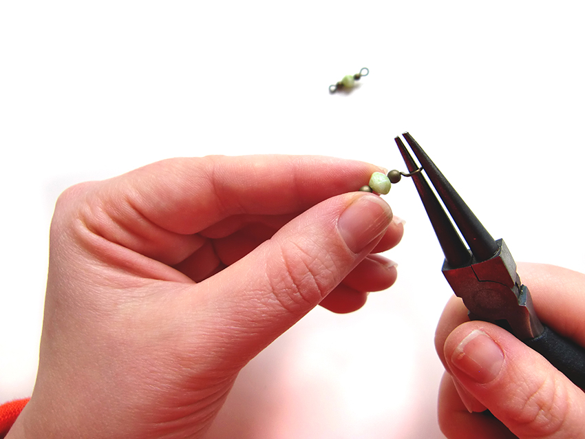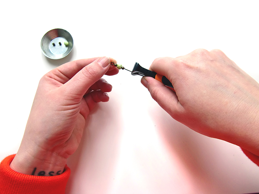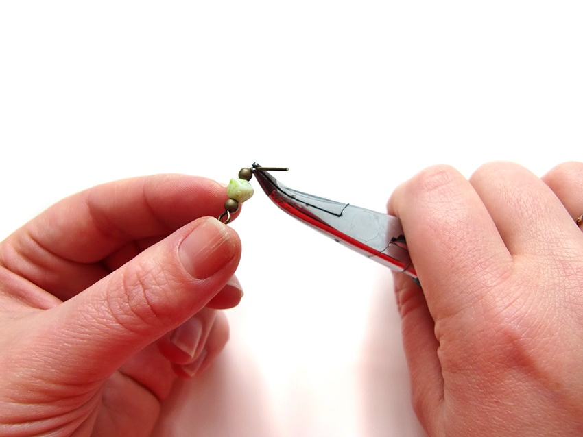Enfilez vos perles sur un clou puis coupez celui-ci à 1cm des perles. Pliez ensuite la tige à 90° avant de créer votre boucle.