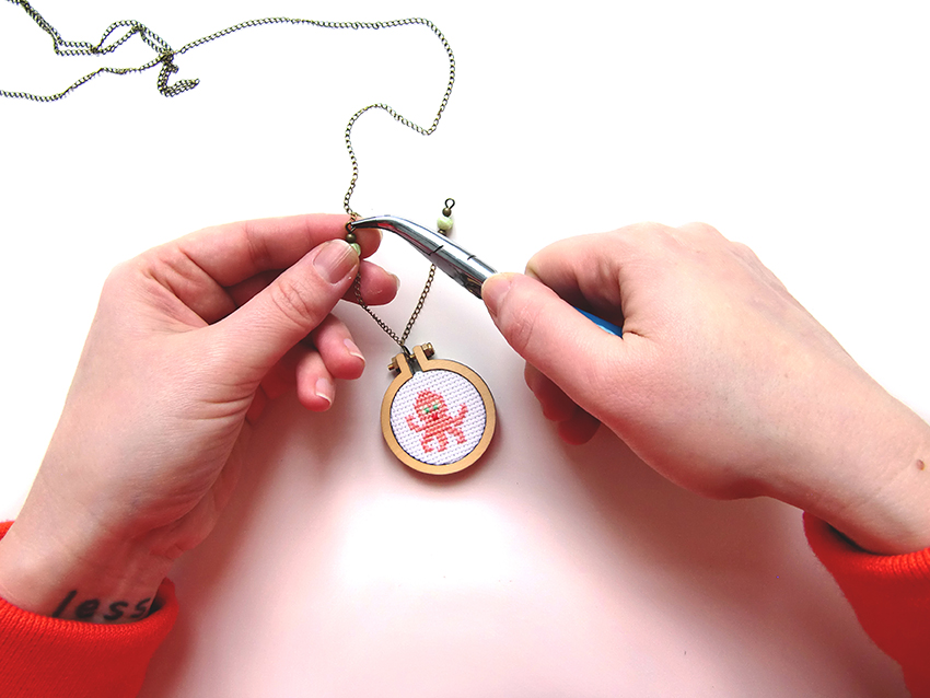 Puis fixez votre anneau au milieu de la chaine avant d’enfiler votre pendentif sur celui-ci.