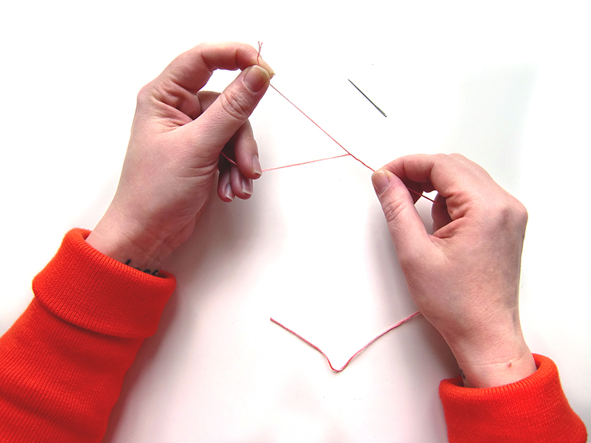 Prenez le fil de votre première couleur et divisez le : d’une main, séparez les brins en deux parties et de l’autre main, tournez les fils pour les séparer.