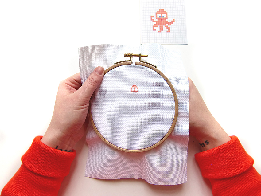 Ensuite, en vous plaçant au centre de votre tambour, commencez à broder la première couleur de votre modèle en ayant vérifié au préalable que le motif rentrait bien dans votre mini-tambour. Attention, les toiles Aïda ne sont pas toutes les mêmes : pour vérifier, je vous conseille de compter le nombre de points en hauteur et en largeur de votre motif et de comparer ce nombre avec celui disponible en plaçant votre toile dans votre mini-tambour.