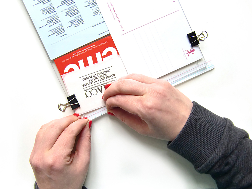 Recréez votre composition sur la plaque de fond en veillant à ne pas couvrir les trous pour passer vos anneaux. Placez la plaque du dessus puis maintenez les deux plaques ensemble à l’aide de pinces à dessins, placées sur 3 côtés.