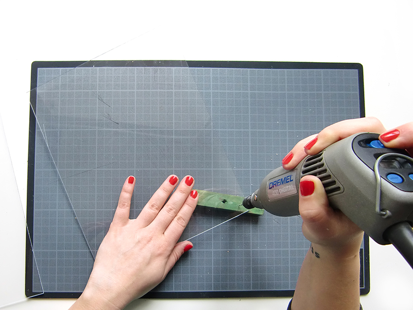 A l’aide d’un cutter bien affuté et d’une règle métallique, tracez une ligne d’un repère à l’autre sur chacune de vos plaques. Pour la découpe d’un plexiglas de 1,5mm, je vous conseille de reproduire ce geste 30 fois dans un sens puis 30 fois dans l’autre sens sur chacune des plaques, en gardant toujours votre règle en place afin d’éviter de « dévier ». Vous pouvez bien sûr passer cette étape en utilisant une scie pour la coupe ou en faisant couper votre plexiglas directement dans votre magasin de bricolage préféré. Mais personnellement, je préfère faire la coupe moi même pour des finitions plus propres.
