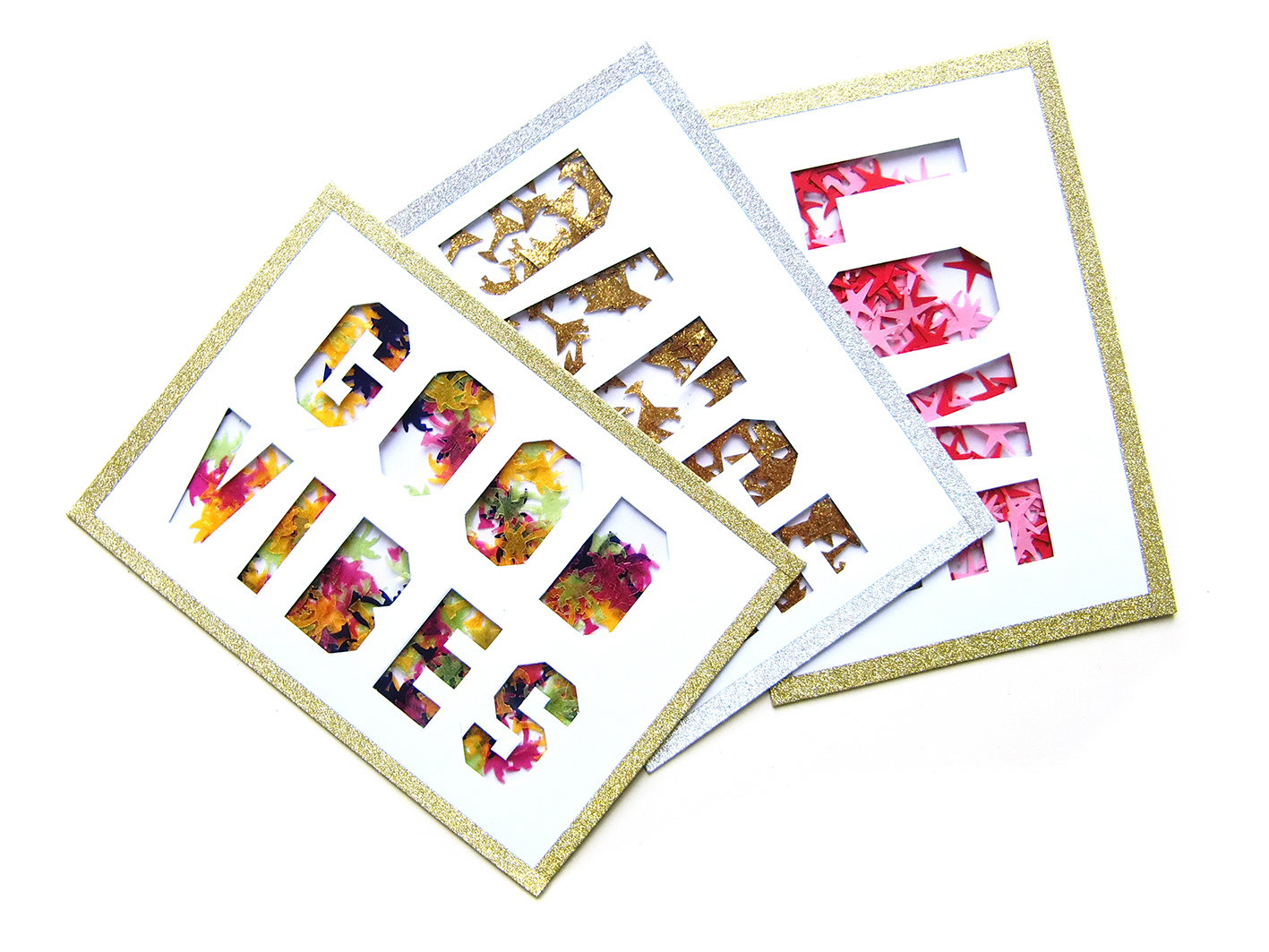 Confettis, paillettes ou découpes en tout genre, mots d’amour ou mantra, il ne vous reste plus qu’à choisir, laisser libre court à votre créativité et à vous amuser.
