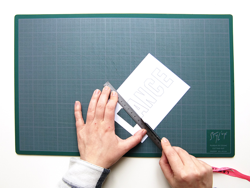 à l’intérieur du cadre imprimé puis évidez les lettres entièrement en coupant à l’extérieur des traits.