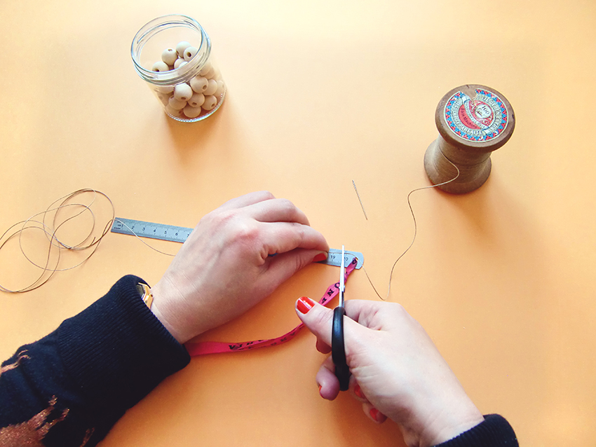– Une bobine de fil. Il faut que votre fil soit bien solide et surtout qu’il ne « glisse »pas. Ici, j’ai choisi du fil de lin mais vous pouvez également utiliser du fil de couture ou du fil métallique si vous le souhaitez. La longueur de fil utilisée varie de 1m à 2m selon les modèles et selon le diamètre de vos perles, n’hésitez donc pas à couper un long fil que vous recouperez par la suite.