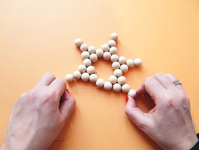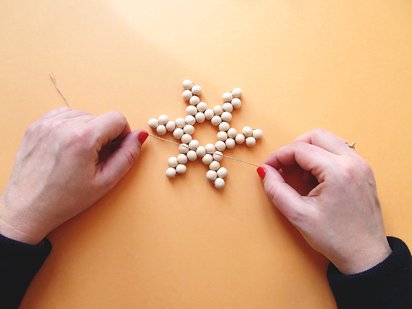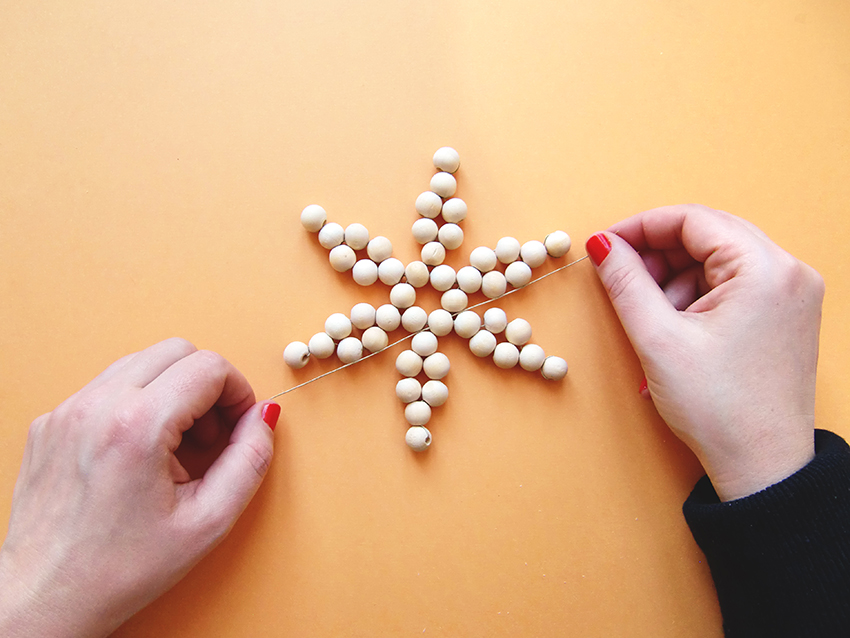 Alors, puisque cette année, on a fait le choix d’un Noël naturel et épuré, j’ai eu envie de créer une série de petits flocons à base de perles de bois et de fil, qui reprennent la technique du tissage de perles classique. A associer à un peu de végétation pour un effet au top.