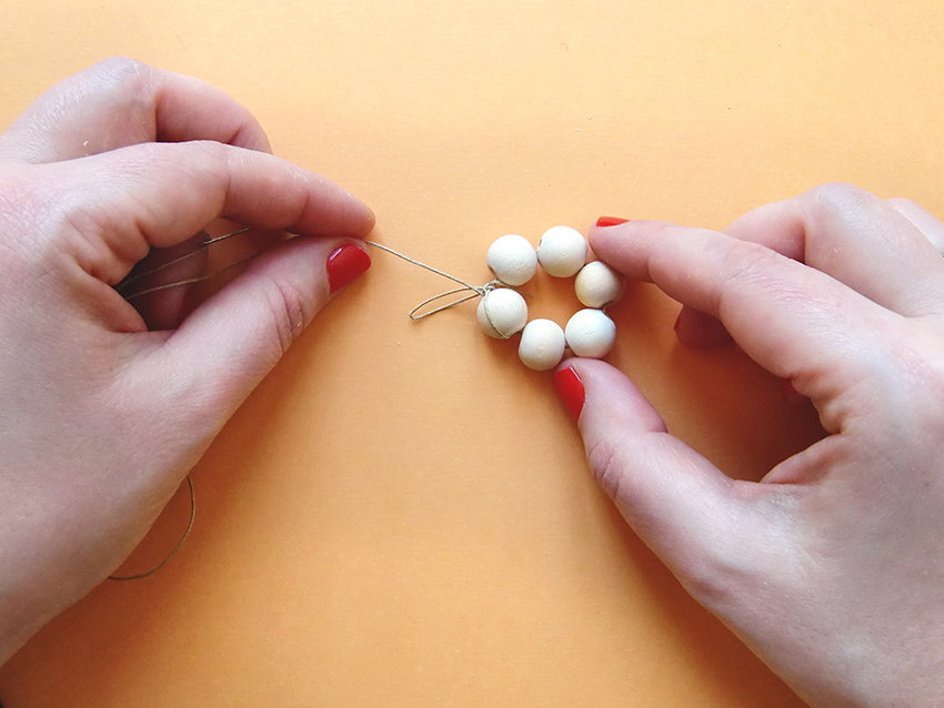 Enfilez maintenant les perles afin de réaliser le centre de votre flocon et repasser votre fil dans la première perle de votre cercle. Pour le flocon n°1, le centre contient 6 perles et pour les flocons n°2 et n°3, 12 perles. Puis tirez bien sur votre fil pour serrer votre cercle.