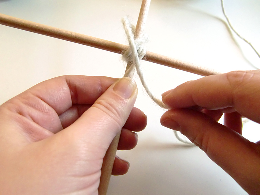 Nouez le fil qui vous servira à lier vos deux bases ensemble sur l’une des baguettes du carré inférieur.