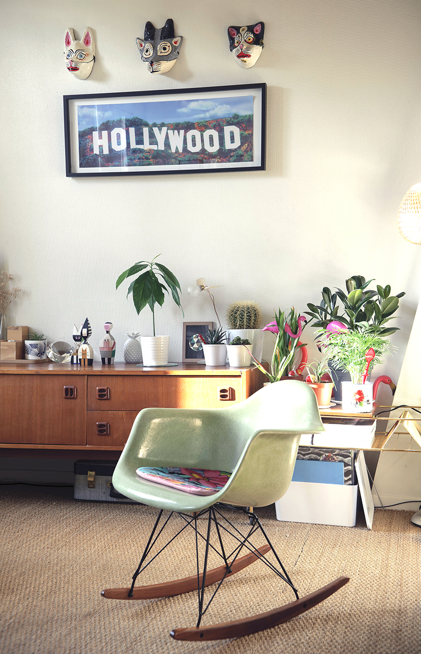 Du vert – needed -, des flamands roses, un clin d’oeil à la Californie, du bois, une collection de mappemondes, une grande bibliothèque et des chaises parfaites, cadeaux de mes 30 ans, des photos souvenirs et de la couleur pour un intérieur cocoon où l’on se sent bien.