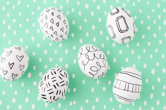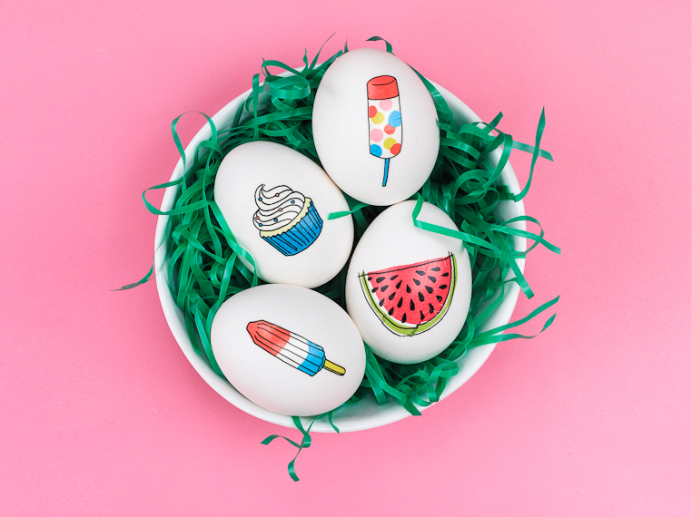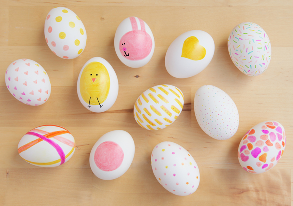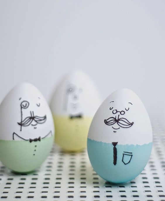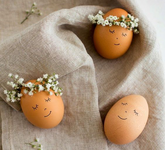 Simplicité et efficacité avec les oeufs poétiques de Tovelisa à l’aquarelle et au posca, les persos rigolos – turlututu chapeau pointu – de Flax And Twine, les gentlemen farmers de Confetti Sunshine, les endormis fleuris de Martha Stewart ou les « Une tâche / Un dessin » de Spoonfull. Pas besoin de tutoriels ici, si ce n’est pour les couronnes fleuris et autres coiffes de fête mais juste de quelques crayons et un peu d’imagination !